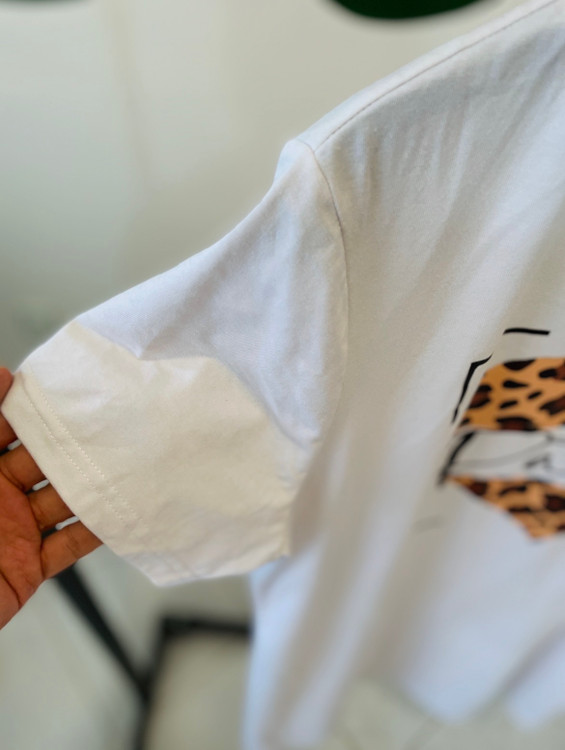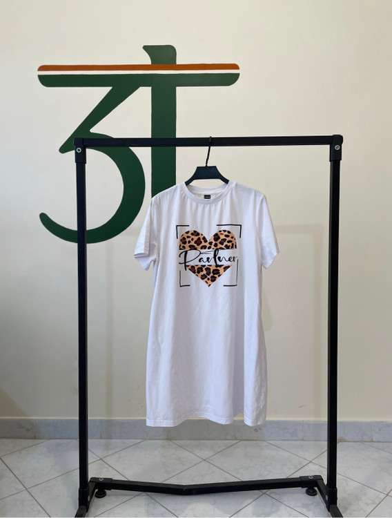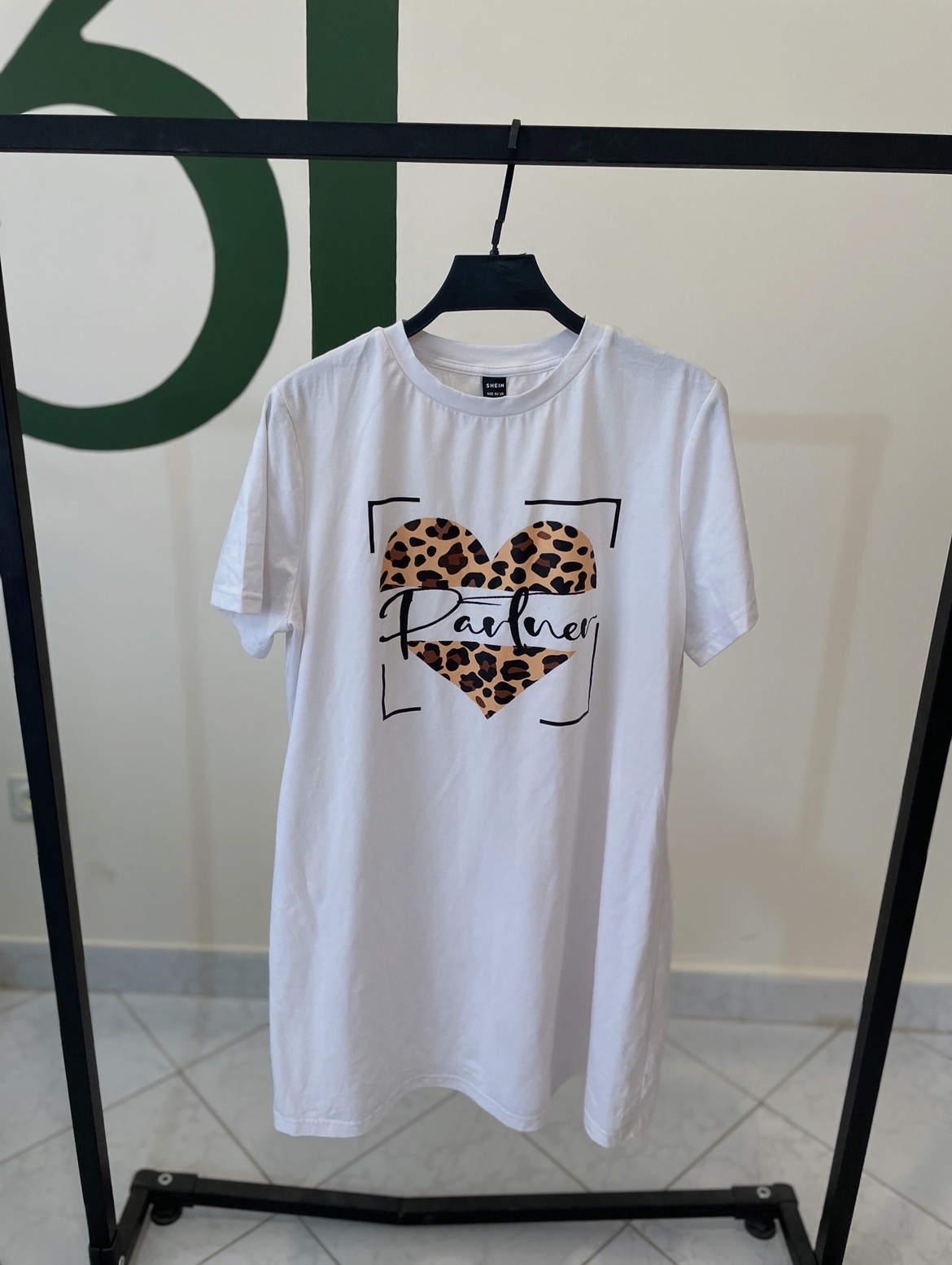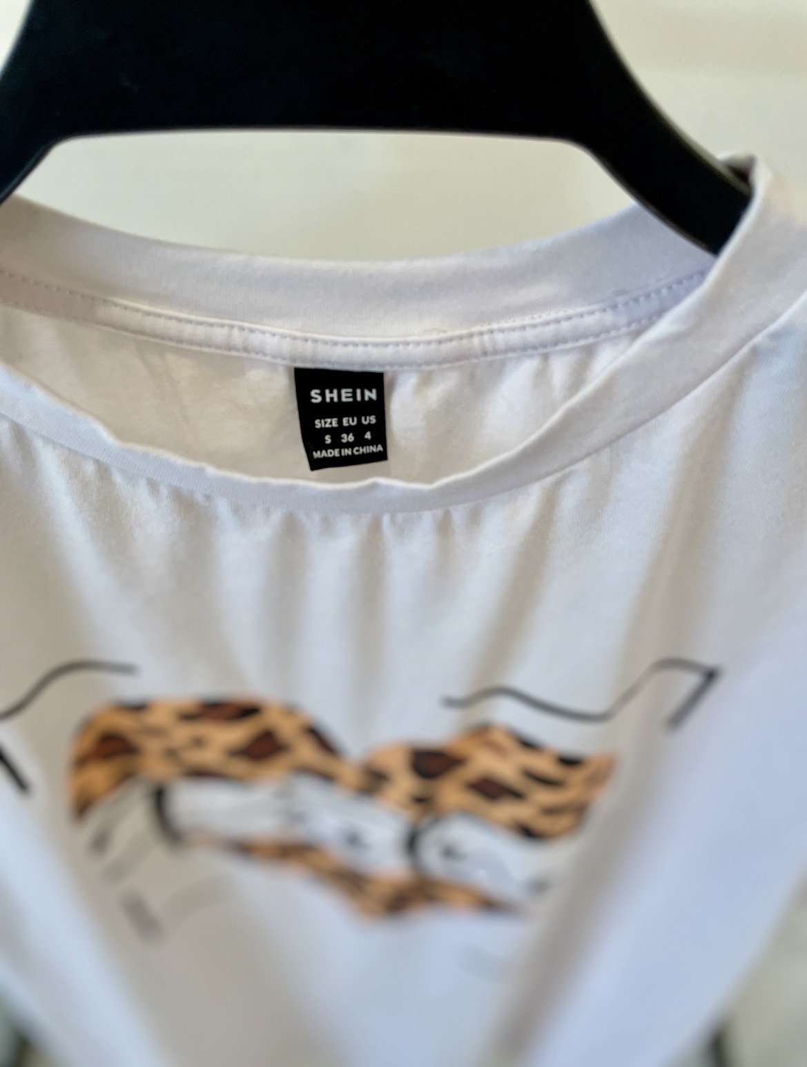 تیشرت زنانه سفید از برند محبوب Shein با طراحی خاص قلب پلنگی روی سینه، انتخابی بینظیر برای استایلهای روزمره، کژوال و اسپرت.