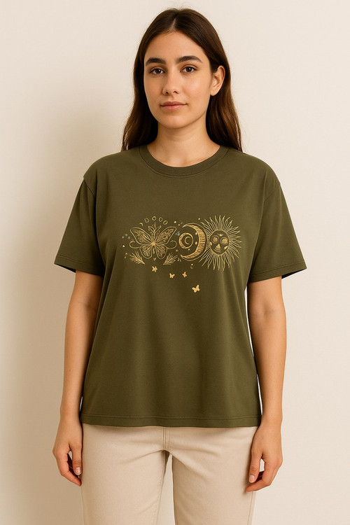 تیشرت زنانه با چاپ طلایی نمادهای طبیعت و کیهان کد: ۳۵۱